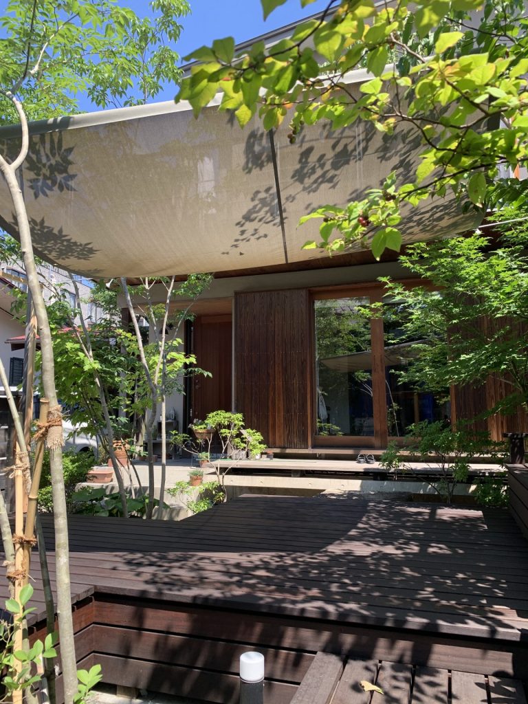 uchida建築アトリエ モデルハウス様のウッドデッキのシェードとして、メッシュテント生地「美影®」を採用いただきました。