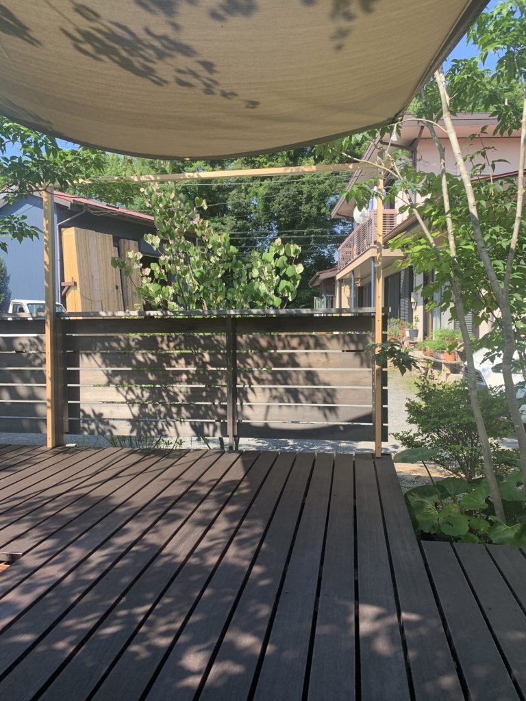 設置いただいたメッシュテント生地が日差しの強い時期にもとても良い感じに日射を調整してくれています。