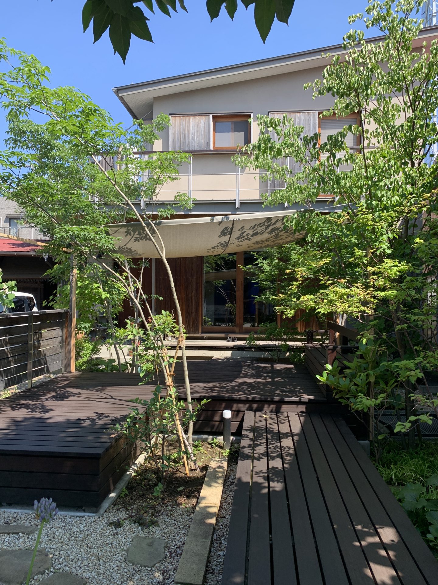 uchida建築アトリエ モデルハウス様のウッドデッキのシェードとして、メッシュテント生地「美影®」を採用いただきました。