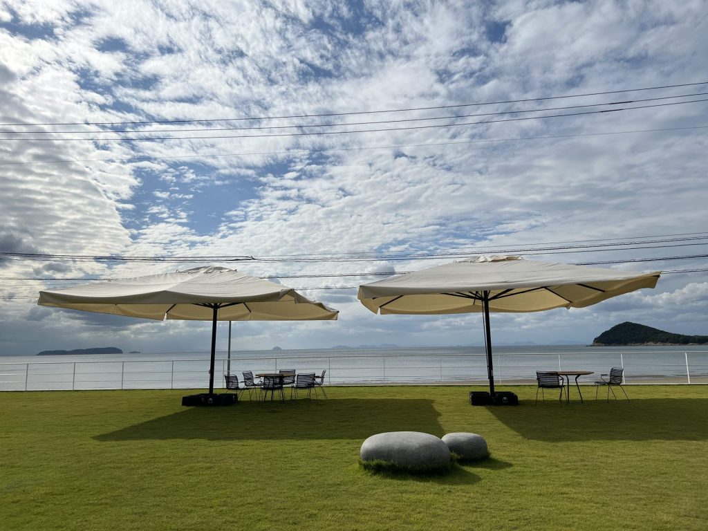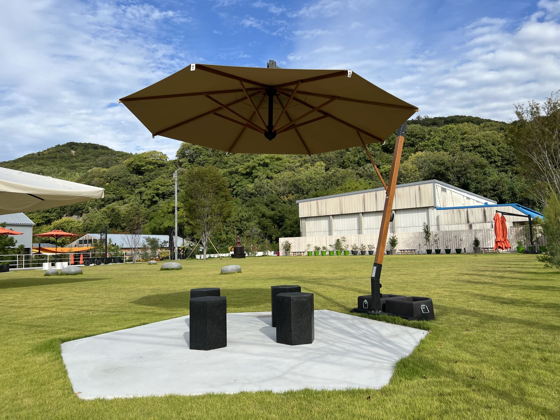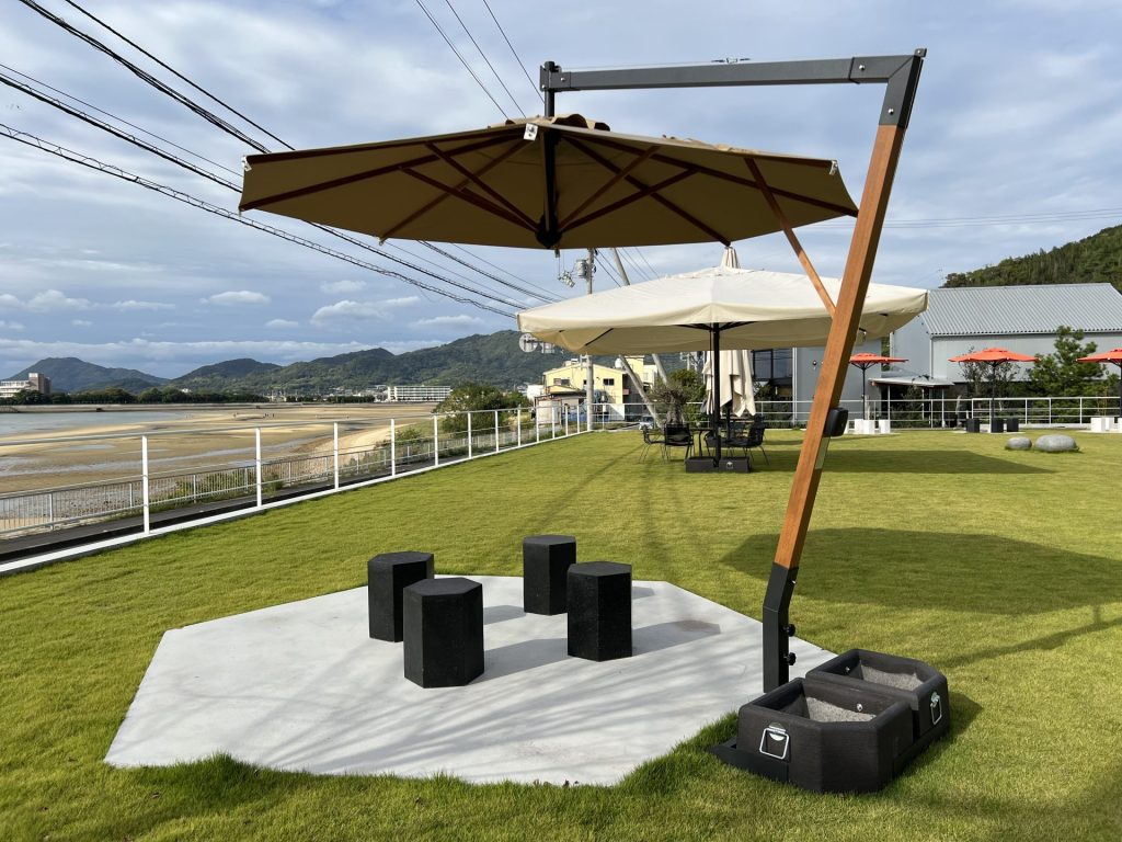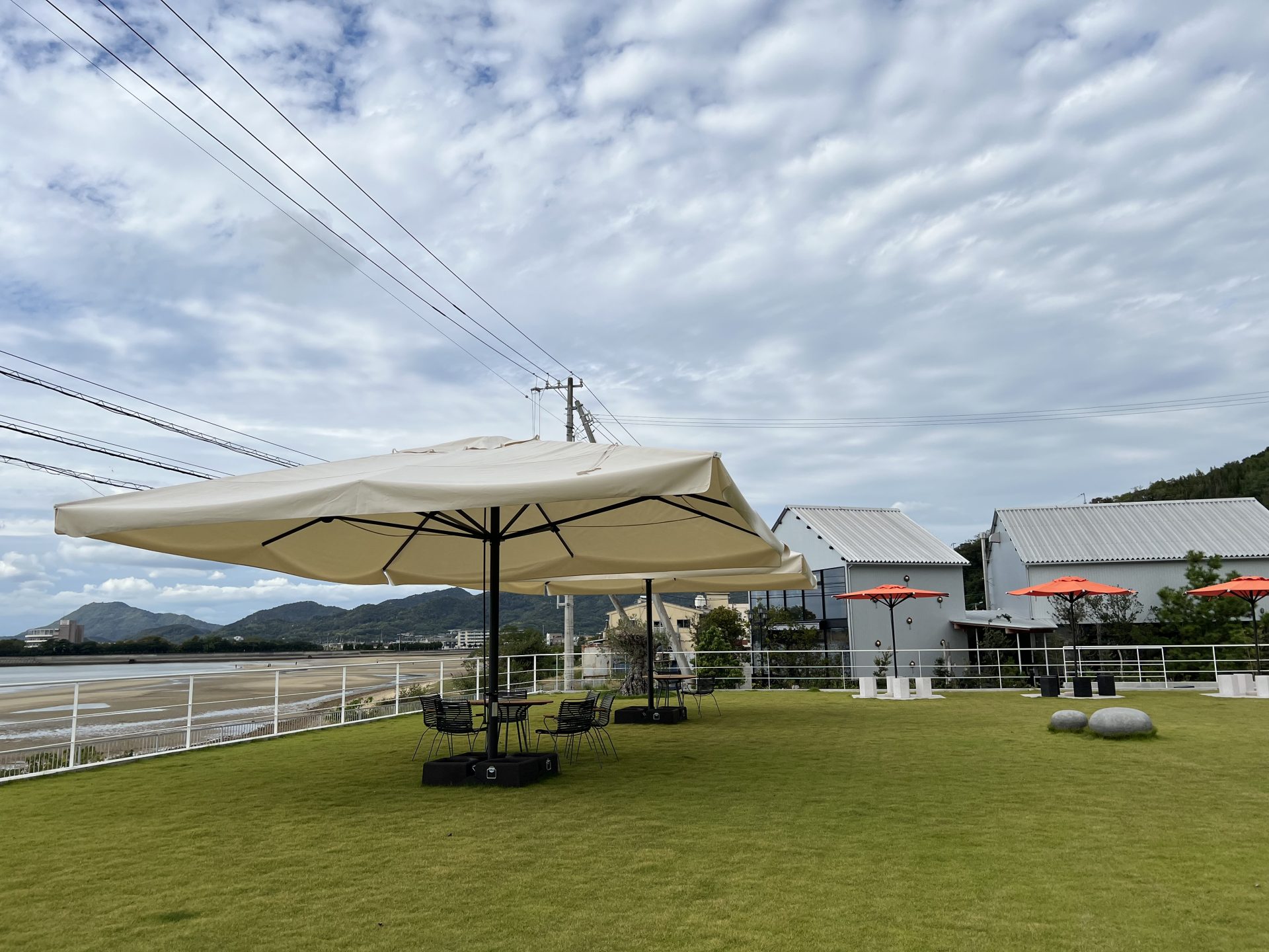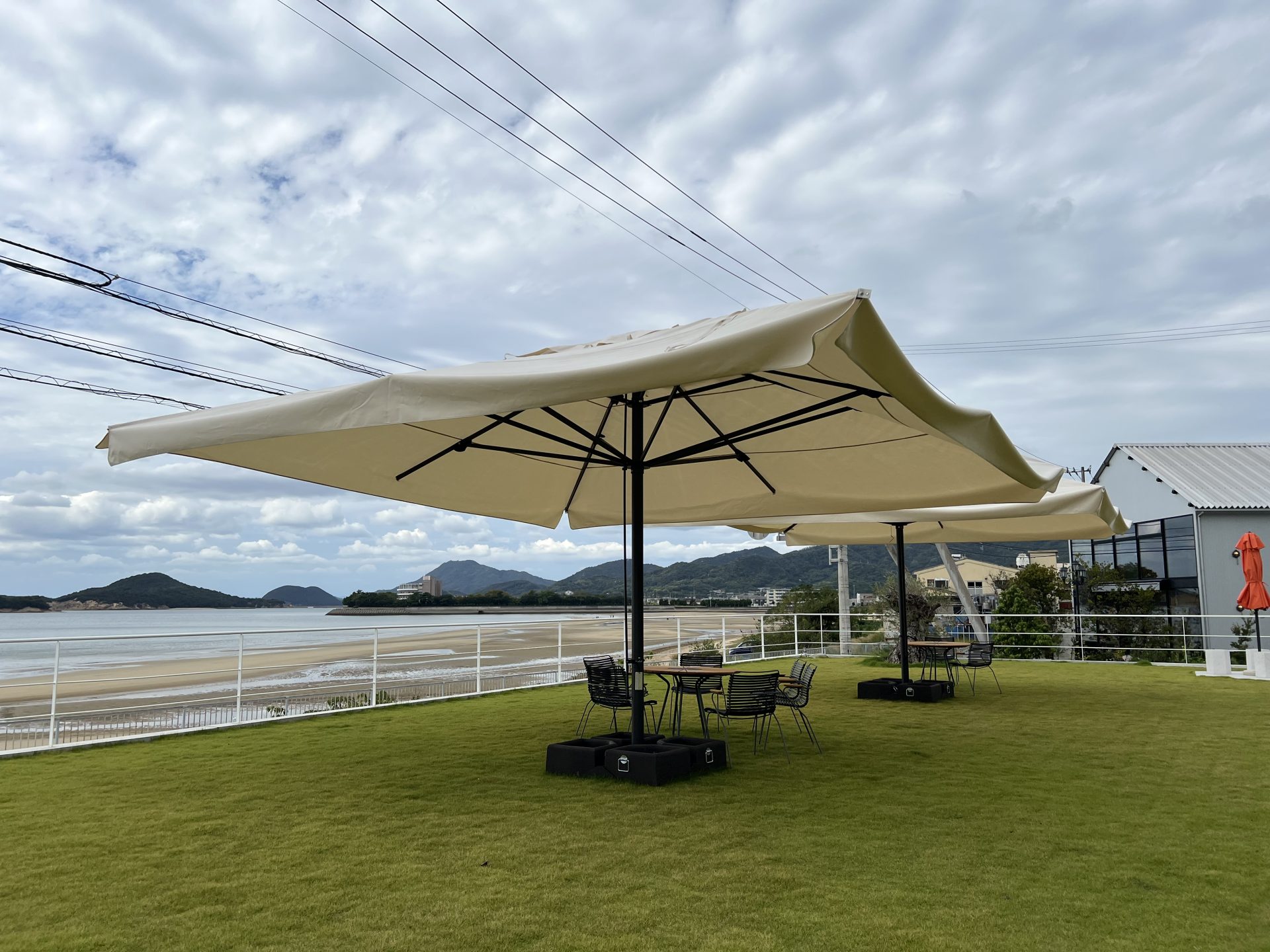 香川県三豊市、父母ヶ浜近くのコーヒースタンド「海辺の珈琲研究所 豆豆豆」様に大型パラソルを設置頂きました。