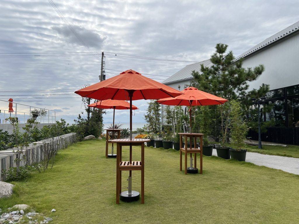 香川県三豊市、父母ヶ浜近くのコーヒースタンド「海辺の珈琲研究所 豆豆豆」様に大型パラソルを設置頂きました。
