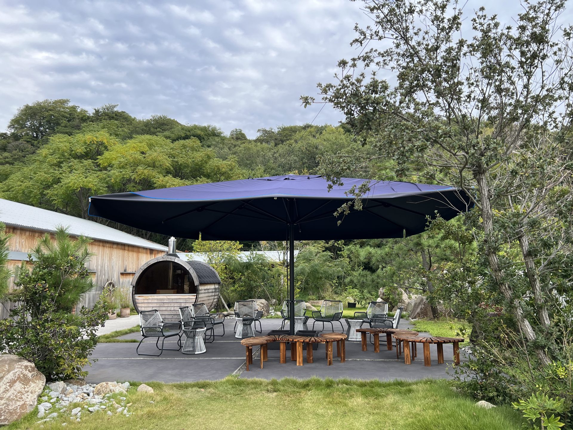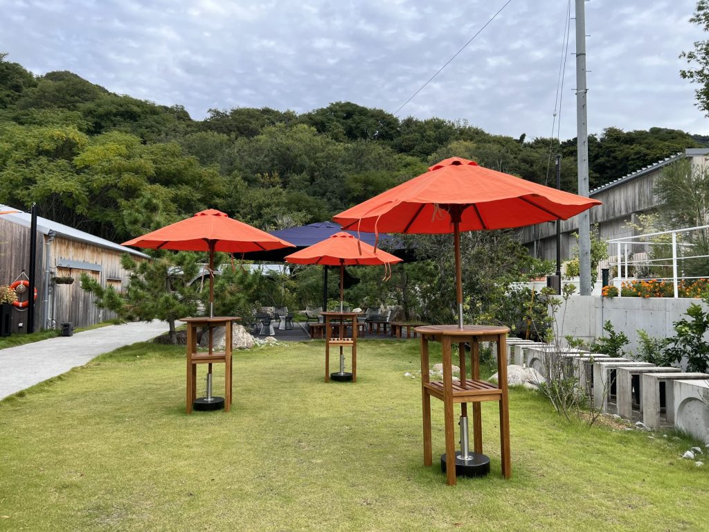 テラスには華やかなオレンジのパラソルと、サウナエリアには落ち着いたインディゴの大型パラソルの下でくつろげるこだわりの空間です。